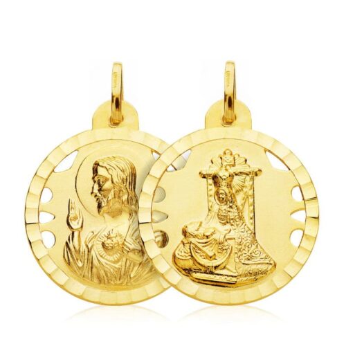Escapulario de oro amarillo 18K, 24 mm, tallado con imagen de la Virgen de Angustias y Corazón de Jesús. Peso de 2.8 g, símbolo de fe.