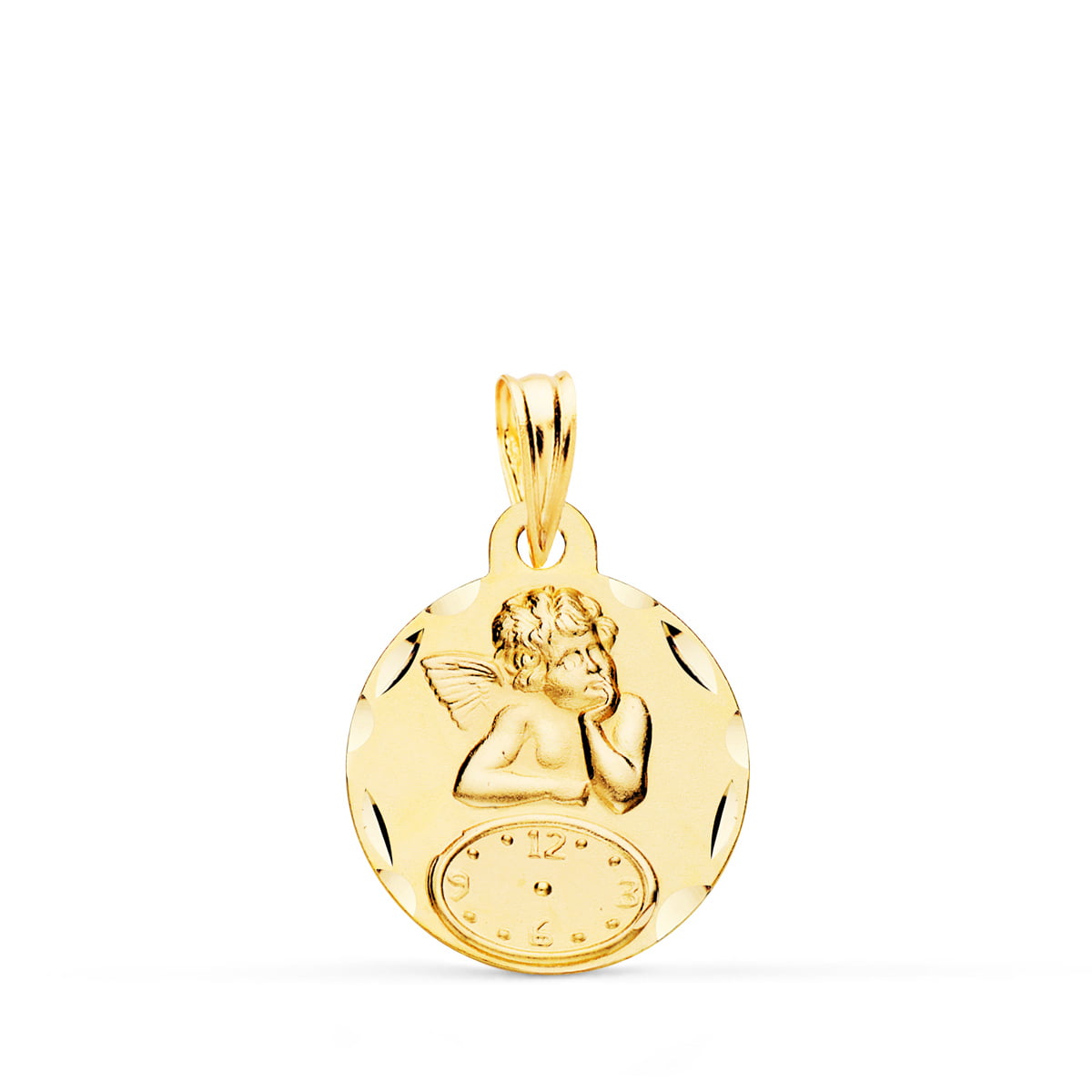 18K MEDALLA REDONDA ANGELITO BURLON CON RELOJ TALLADA. 15 MM