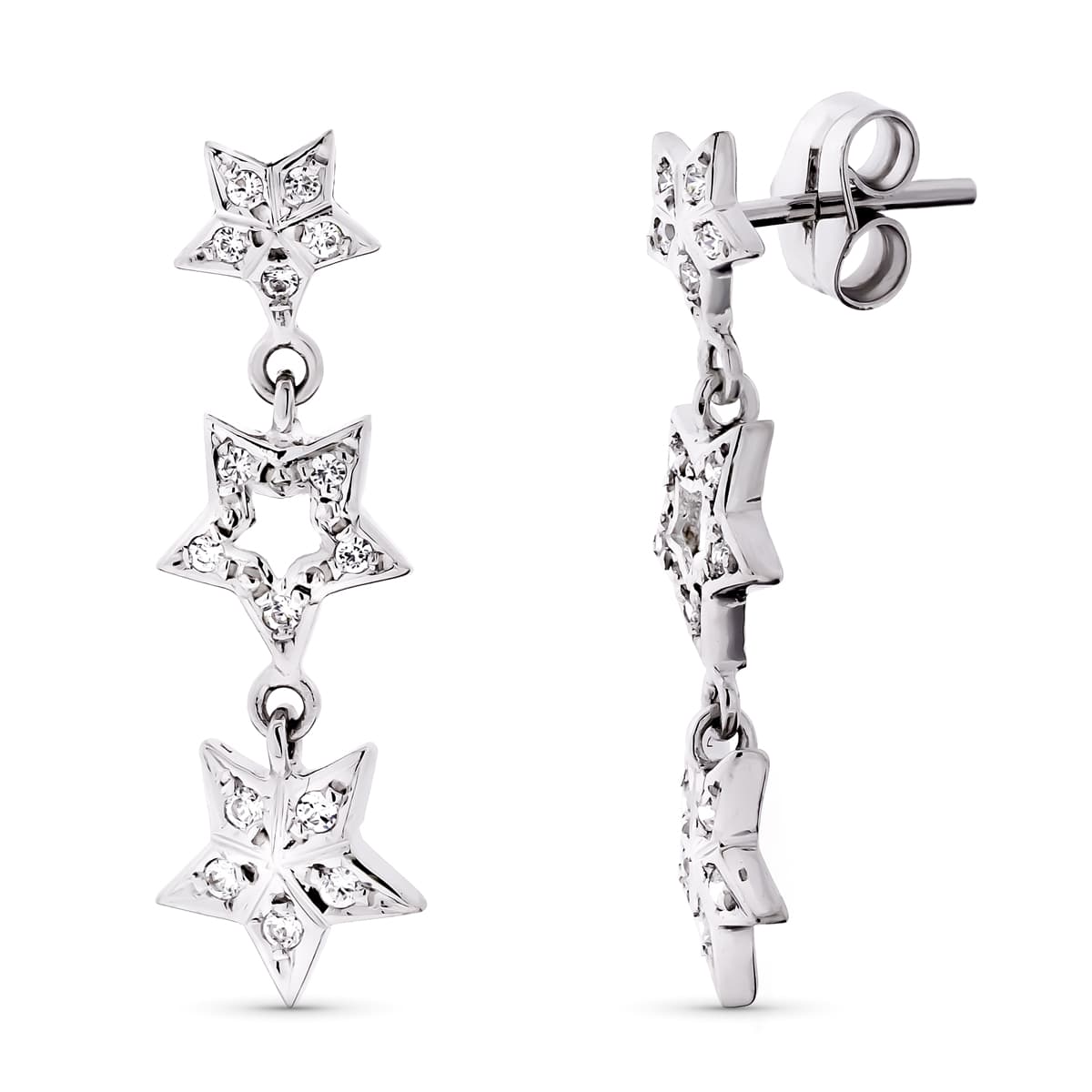 18K PENDIENTES ORO BLANCO LARGOS CIRCONITA Y ESTRELLAS. 27 X 8 MM