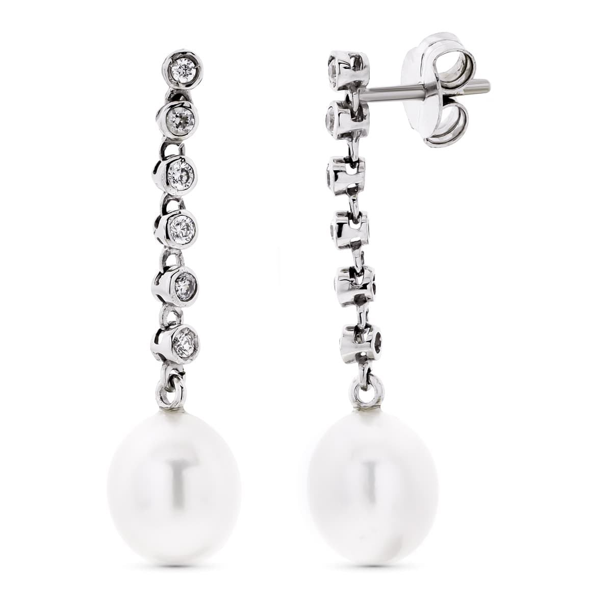18K PENDIENTES ORO BLANCO LARGOS CON CIRCONITAS Y PERLAS. CIERRE PRESION