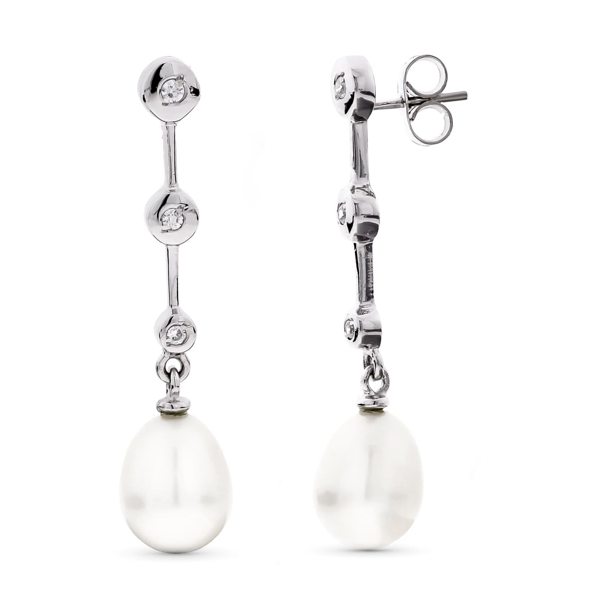 18K PENDIENTES ORO BLANCO LARGOS PERLA Y CIRCONITAS CIERRE PRESION