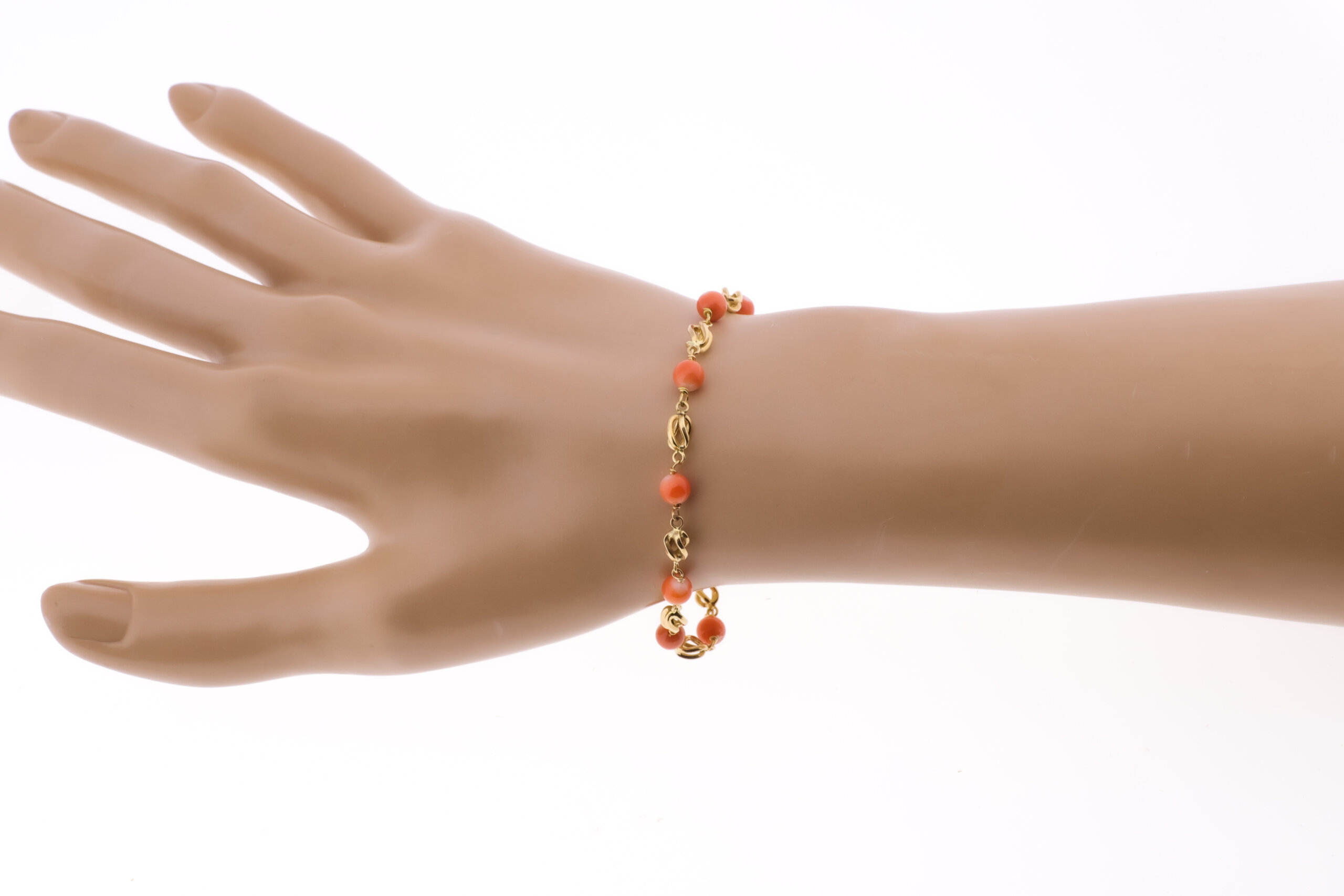 18K PULSERA ORO AMARILLO CON JAULAS Y CORAL FINO JAPONES 5 MM. 20 CM