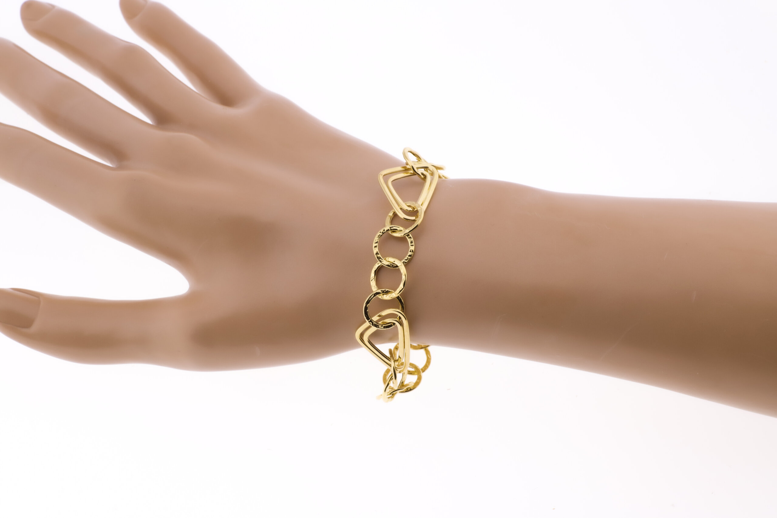 18K PULSERA ORO AMARILLO ESLABONES HUECOS TRIANGULO Y REDONDOS