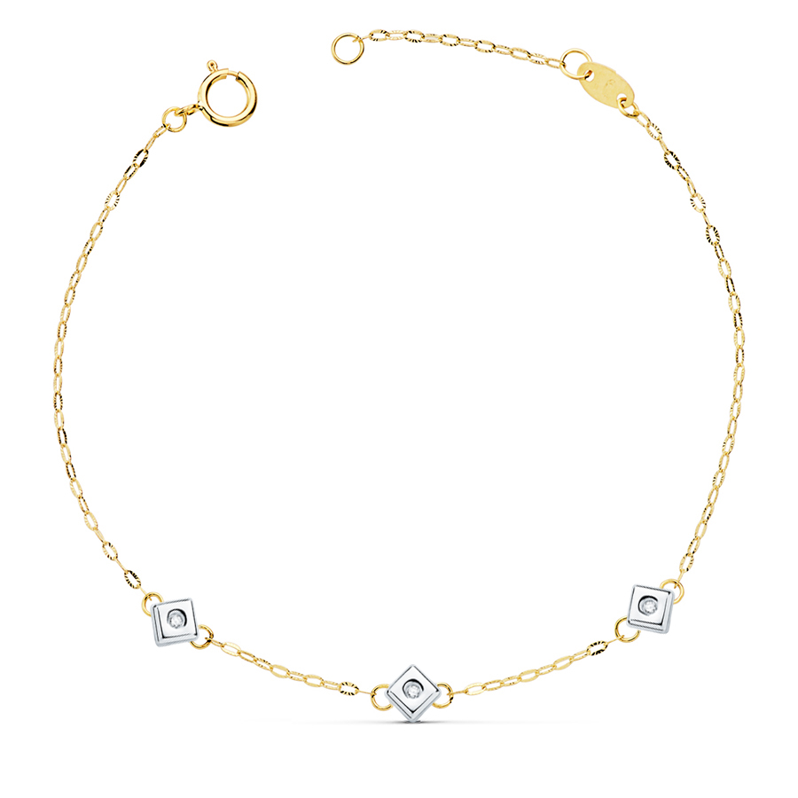18K PULSERA ORO BICOLOR CHATON DE 3 ROMBOS CON DIAMANTES SI-H 0,045 QTES. 17 CM