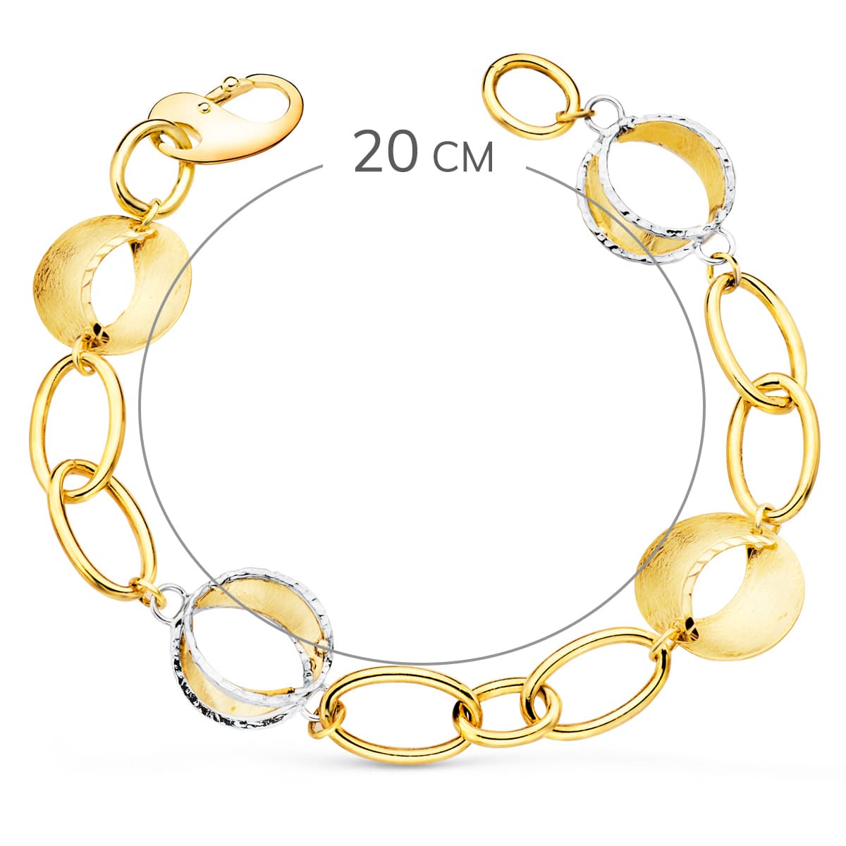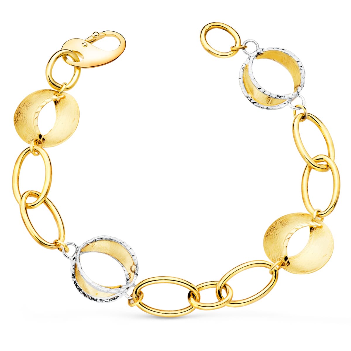 18K PULSERA ORO BICOLOR ESLABONES OVALES Y MOTIVOS REDONDOS RAYADOS. 20 CM.