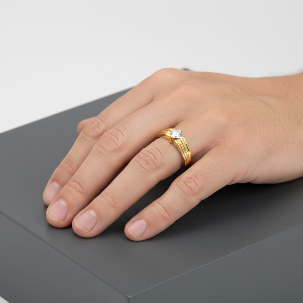 Solitario caballero de oro amarillo 18K, ancho de 7.5 mm, con circonita de 5.5 mm. Peso de 6.05 g, perfecto para destacar con elegancia.