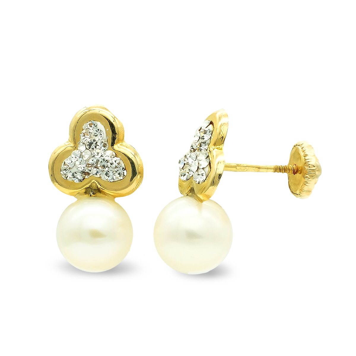 9K PENDIENTES COMUNION ORO AMARILLO TREBOL Y PERLA CULTIVADA 14X8 MM PRESION
