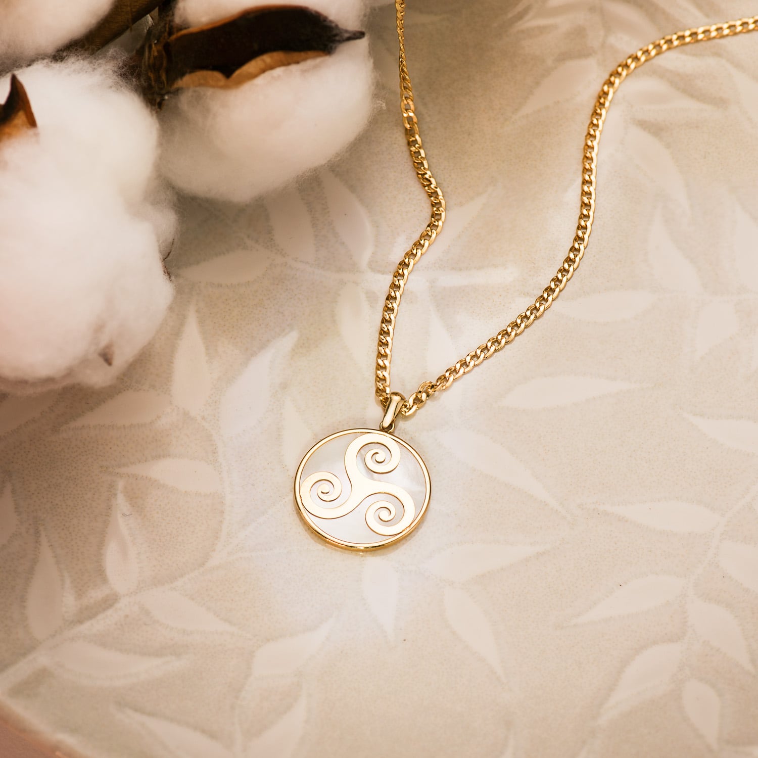 COLGANTE ORO AMARILLO Y NÁCAR SIMBOLO CELTA TRISQUEL 20 MM.