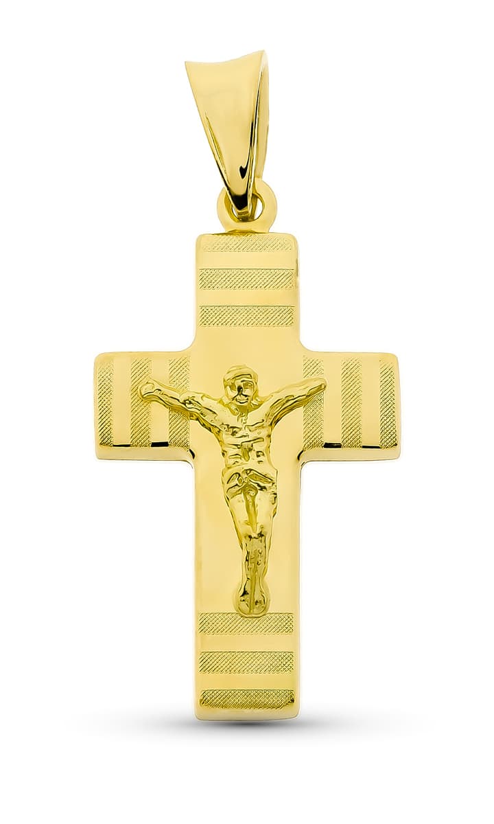 18K CRUZ ORO AMARILLO HUECA CON CRISTO MATE Y BRILLO 27X15 MM