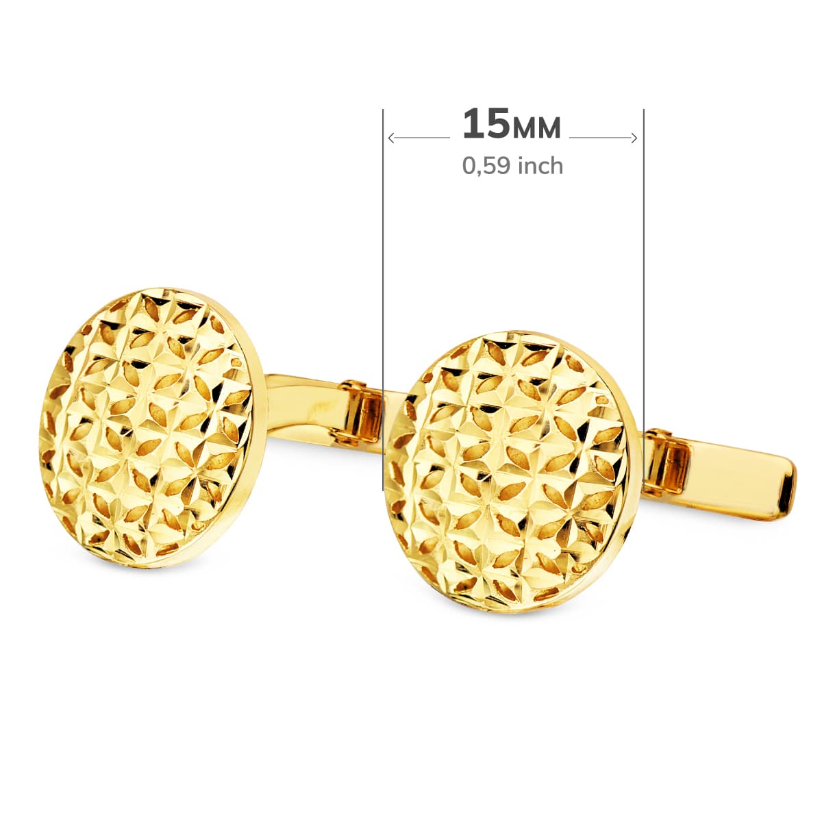 GEMELOS O.AMARILLO REDONDOS TALLADOS Y CALADOS 15 MM. CIERRE RÍGIDO OSCILANTE.