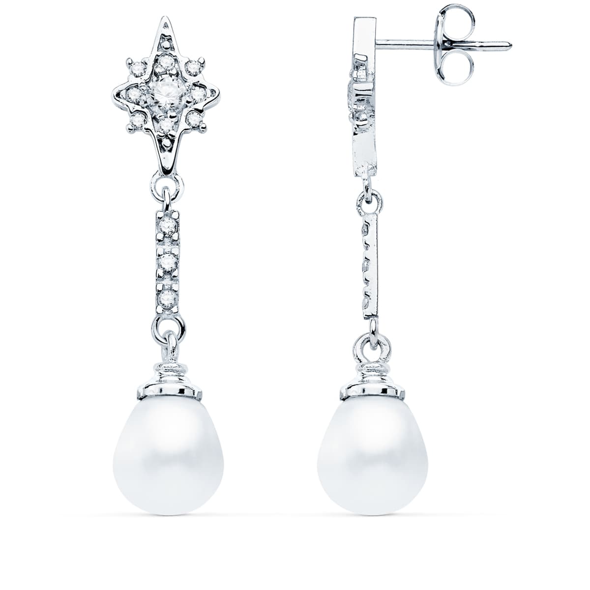 18K PENDIENTES LARGOS ORO BLANCO PERLA Y CIRCONITAS 36X8 MM