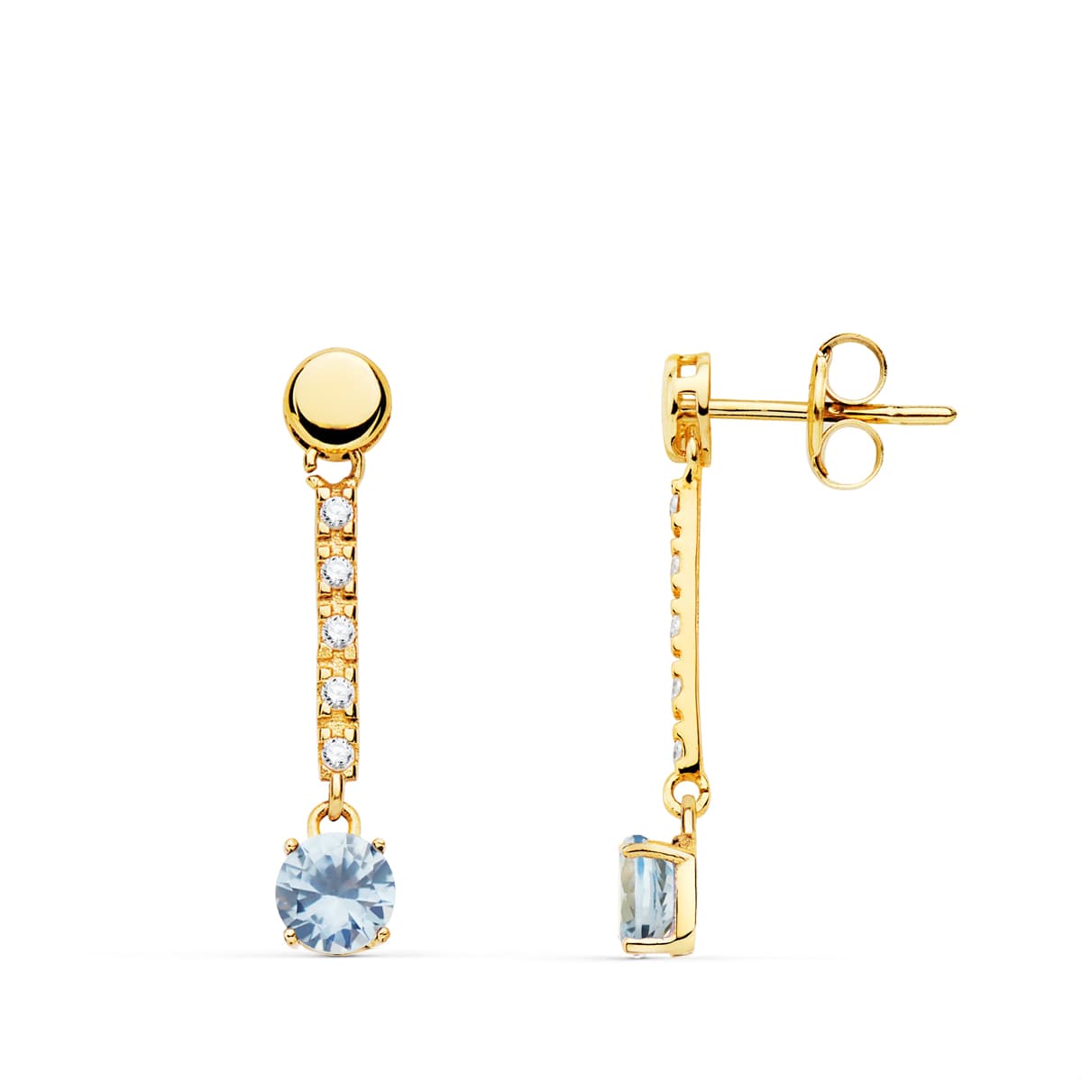 PENDIENTES ORO AMARILLO PIEDRA REDONDA COLOR AGUA MARINA. 25 X 5 MM.