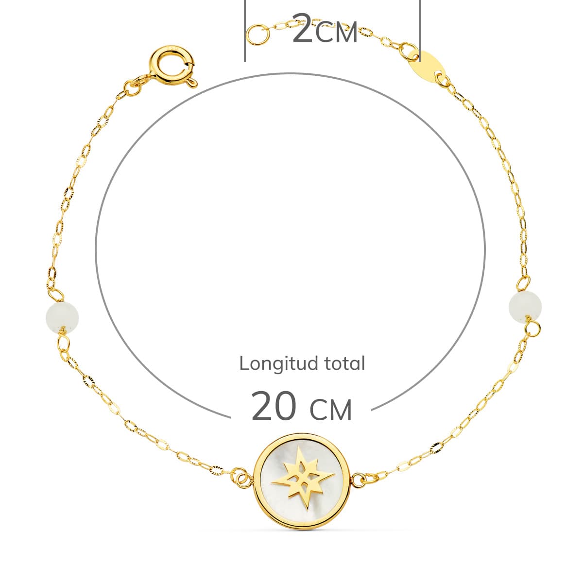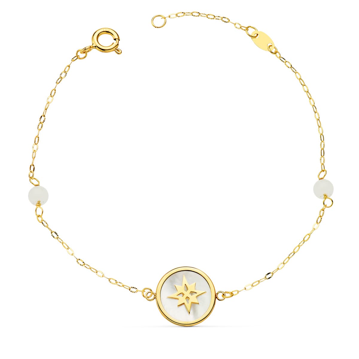 PULSERA NÁCAR Y ROSA DE LOS VIENTOS 12 MM Y BOLAS JADE 4 MM. CADENA 18 + 2,5 CM