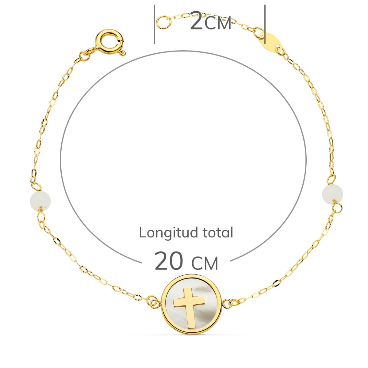PULSERA O.AMARILLO NÁCAR CON CRUZ 12 MM Y BOLAS JADE 4 MM. CADENA 18 + 2,5 CM