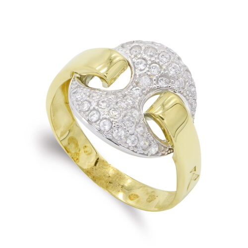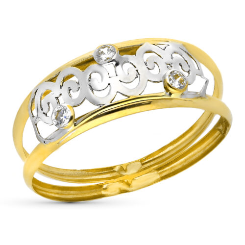 18K SORTIJA ORO BICOLOR DOS CUERPOS CON MOTIVO CALADO Y CIRCONITAS. ANCHO: 8 MM